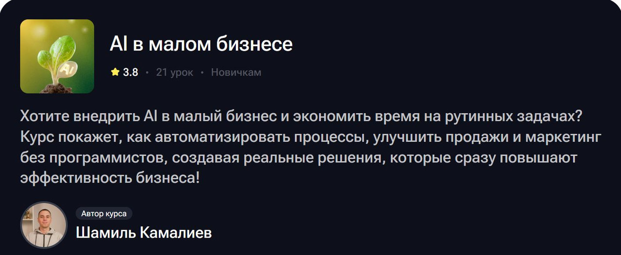 Курс "AI в малом бизнесе" с Шамилём Камалиевым — это 21 занятие о том, как внедрить искусственный интеллект в реальную работу без программистов, консультантов за миллион и долгих мучительных внедрений, после которых хочется всё вернуть как было.